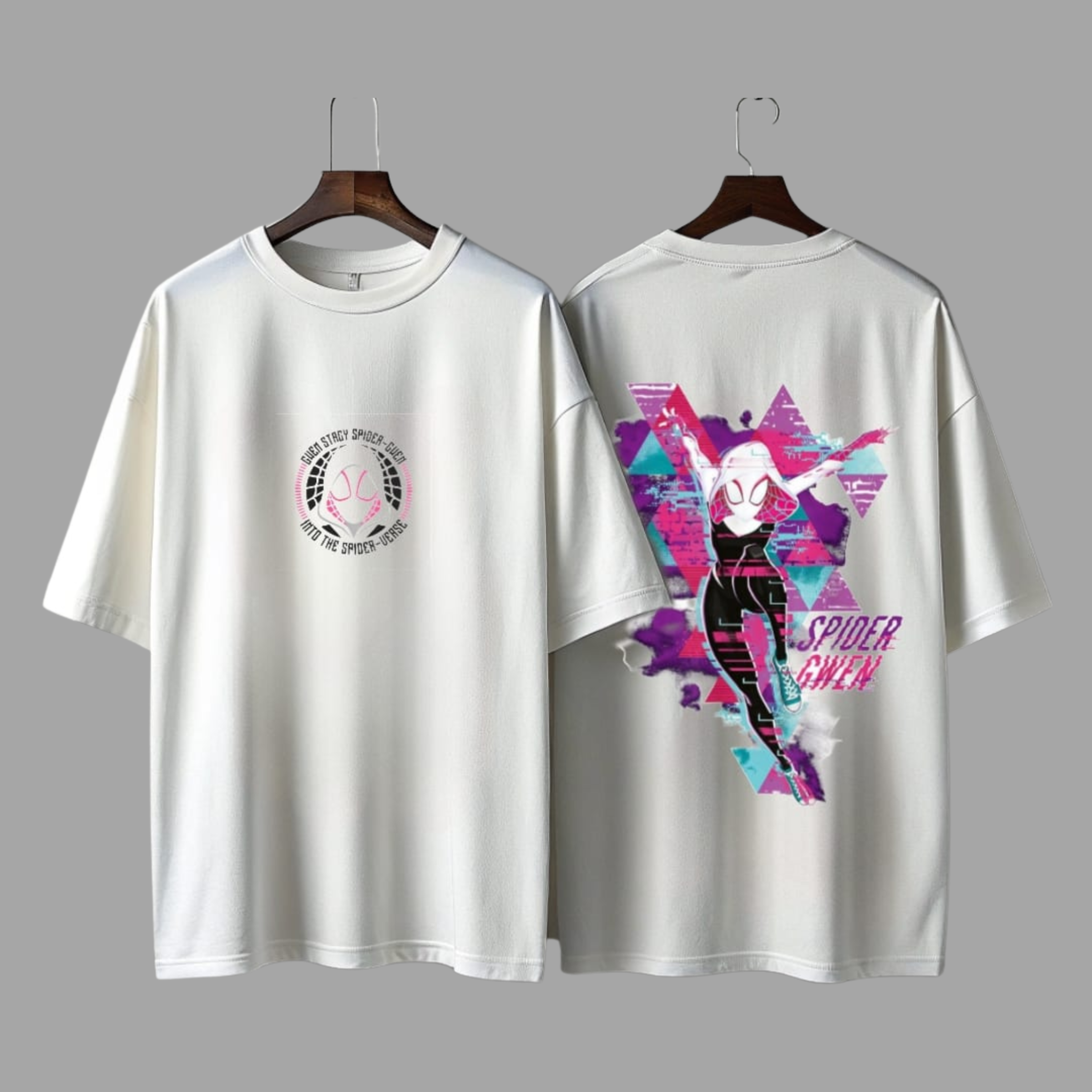 Step into the Spider-Verse with this exclusive Miles & Gwen T-shirt combo. Featuring bold, high-quality prints of Miles Morales and Spider-Gwen, these tees are designed for true fans who value style and comfort. Made from premium breathable cotton, each shirt delivers a relaxed fit perfect for casual wear or streetwear looks. The Miles tee showcases dynamic swinging artwork on the front and an action-packed spider web design on the back. The Gwen tee features a minimal front emblem and a vibrant glitch-art inspired back print. Wear them solo or mix and match for a striking duo that celebrates your love for the Spider-Verse.